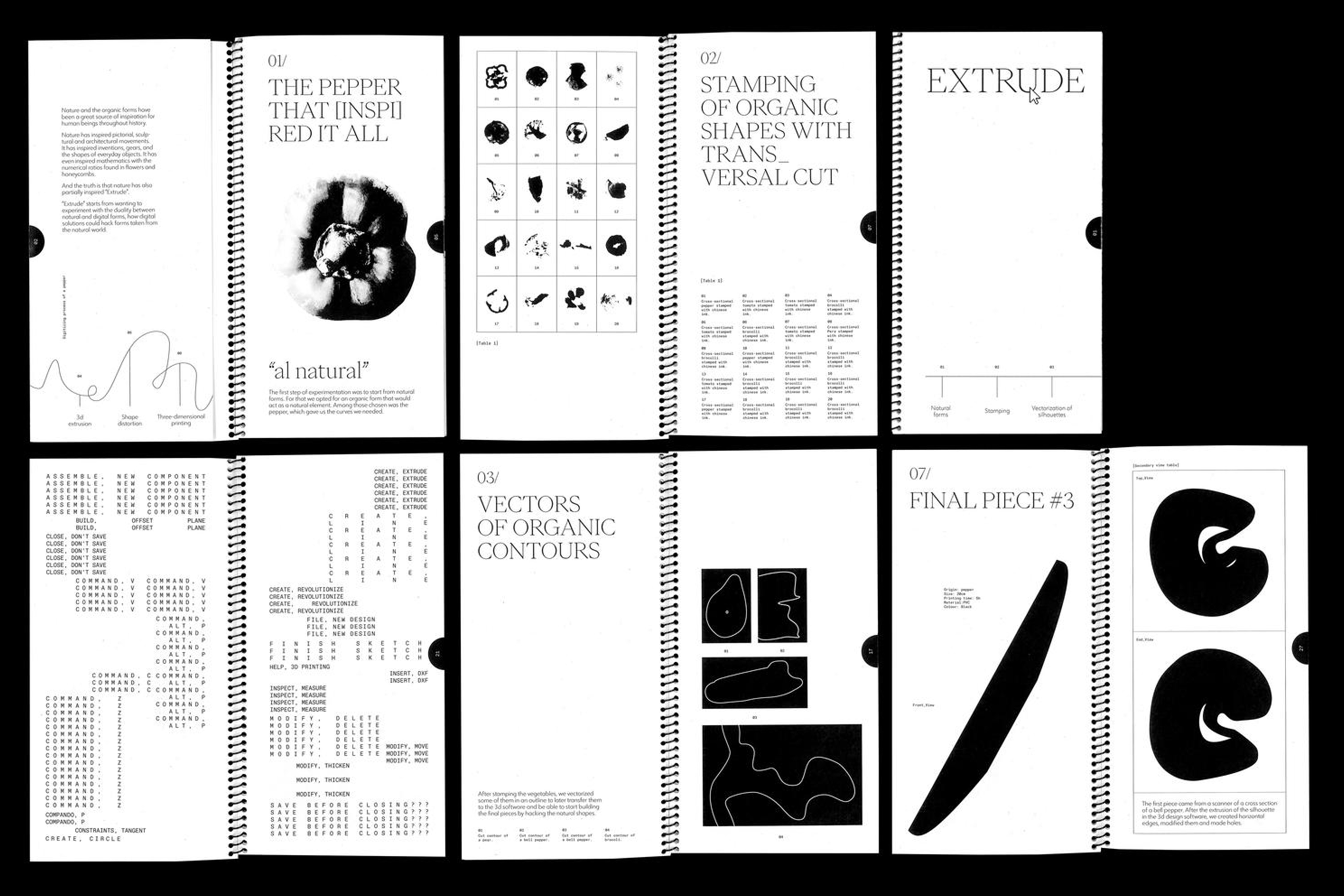 Finally, an editorial was designed that explains the entire hacking process of the organic form, from the stamping of the pepper, to the residues that generated the printing of the three objects with PLA.